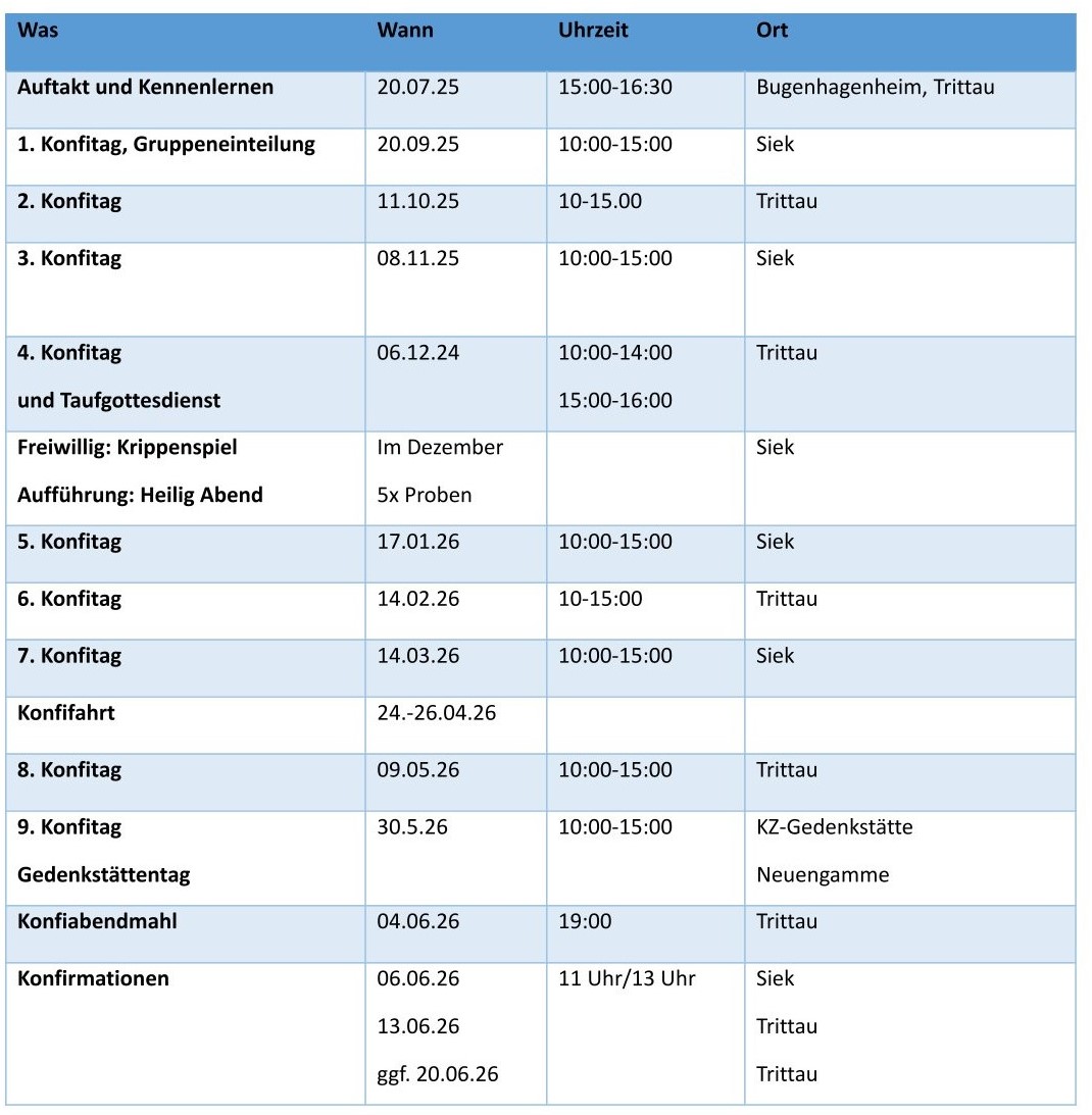 Die Zeitplanung steht, Konzept und Ablauf findet Ihr hier. Der Kurs beinhaltet 8 Konfisamstage (10:00 – 15:00 Uhr, abwechselnd in Siek und Trittau), eine Konfifahrt, 12 Gottesdienste, 4 Credits, eine Exkursion. Dabei wird in Gruppen mit 10 – 15 Konfirmand*innen gearbeitet.